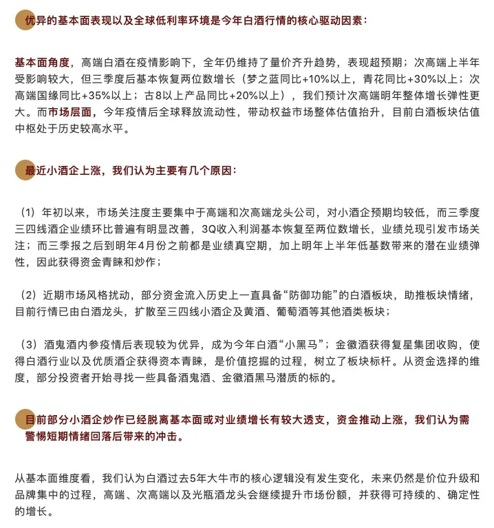 中金公司用一篇《小酒热下的冷思考》的研报总结了当时小酒企上涨的原因以及后市的思考。