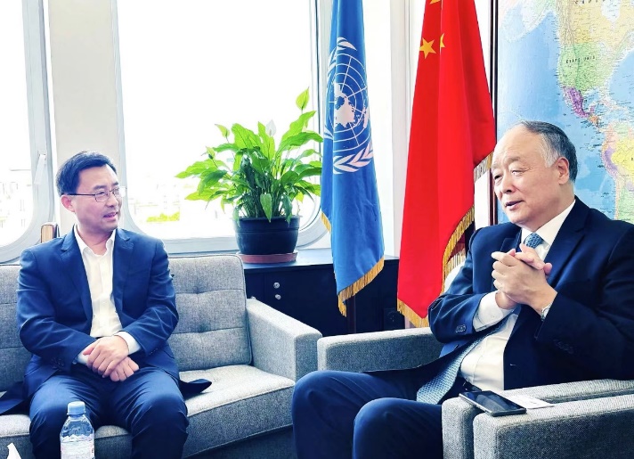 张联东(左)与中国常驻联合国教科文组织代表杨进座谈交流