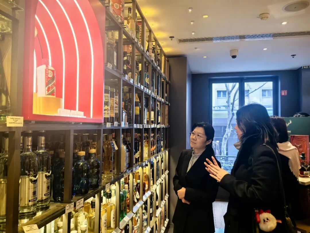 代表团还考察了巴黎老佛爷商场的酒窖专区,重点关注其品类规划、渠道建设及产品展陈,为优化茅台酒在欧洲终端体验提供参考。