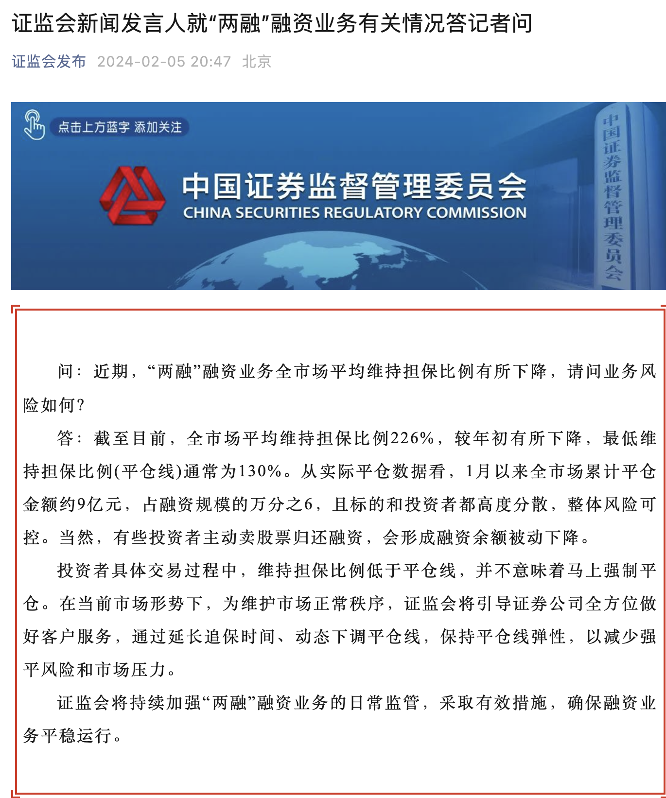 2月5日,证监会新闻发言人答记者问时表示,截至目前,全市场平均维持担保比例226%,较年初有所下降,最低维持担保比例(平仓线)通常为130%。从实际平仓数据看,1月以来全市场累计平仓金额约9亿元,占融资规模的万分之6,且标的和投资者都高度分散,整体风险可控。