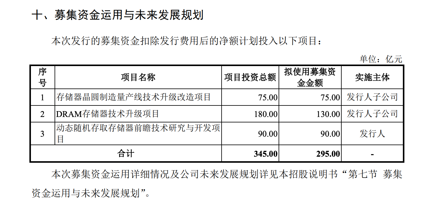 招股书申报稿显示,长鑫科技拟募集资金总额为295亿元,将用于“存储器晶圆制造量产线技术升级改造项目”“DRAM存储器技术升级项目”“动态随机存取存储器前瞻技术研究与开发项目”等。