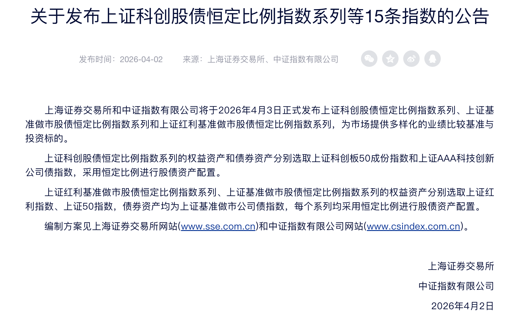 本报讯 (记者毛艺融)4月2日,中证指数有限公司官网显示,上海证券交易所和中证指数有限公司将于2026年4月3日正式发布上证科创股债恒定比例指数系列、上证基准做市股债恒定比例指数系列和上证红利基准做市股债恒定比例指数系列,为市场提供多样化的业绩比较基准与投资标的。