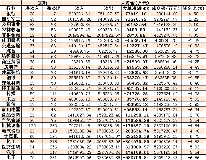 从资金层面看,今日A股大单资金整体净流出307.7亿元,其中,有1170只个股净流入,2850只个股净流出。从申万一级的28个行业来看,银行、国防军工、公用事业、农林牧渔、非银金融等5个行业呈现大单资金净流入态势,其中,银行、国防军工、公用事业等三行业资金净流入均超5亿元,分别为7.7亿元、7.16亿元、5.02亿元,合计资金净流入达19.88亿元。另外,电子、汽车、医药生物、化工等四行业资金净流出居前,均超30亿元。