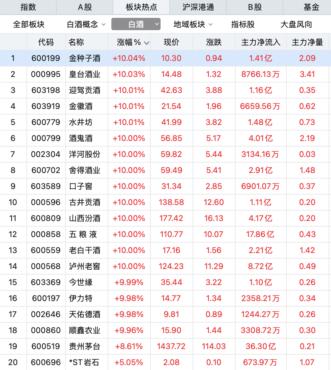 从个股来看,截至当日收盘,20家白酒上市公司中,金种子酒、皇台酒业、迎驾贡酒、金徽酒、水井坊、酒鬼酒、舍得酒业、洋河股份、口子窖、古井贡酒、山西汾酒、五粮液、老白干酒、泸州老窖、今世缘、伊力特、天佑德酒、顺鑫农业、*ST岩石等19家公司股价涨停,贵州茅台涨幅亦达8.61%。