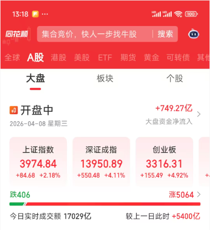 周三(4月8日),A股市场迎来放量大涨,呈现普涨格局。截至记者发稿,上证指数上涨2.18%,报3974.84点;深证成指上涨4.11%,报13950.89点;创业板指上涨4.92%,报3316.31点。沪深两市合计成交额17029亿元,市场交投保持活跃。总体来看,两市个股涨多跌少,5064只个股实现上涨。