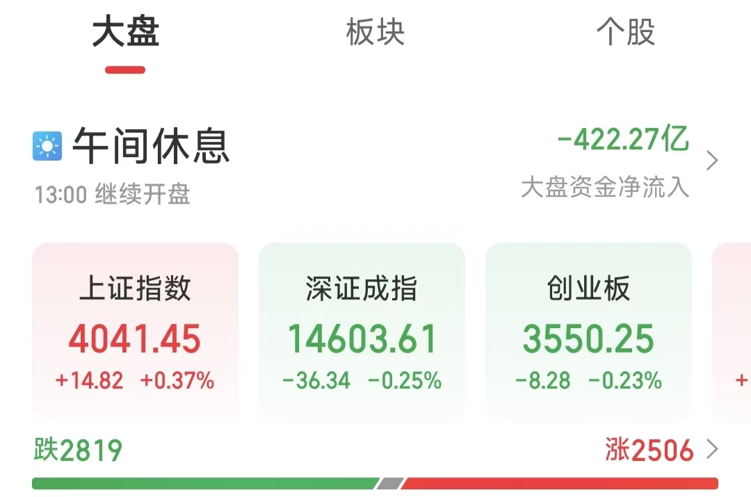 周三(4月15日),早盘呈现震荡格局。截至上午收盘,上证指数上涨0.37%,报4041.45点;深证成指下跌0.25%,报14603.61点;创业板指下跌0.23%,报3550.25点。沪深两市合计成交额15841.16亿元,市场交投活跃。总体来看,个股呈现分化态势,跌多涨少。