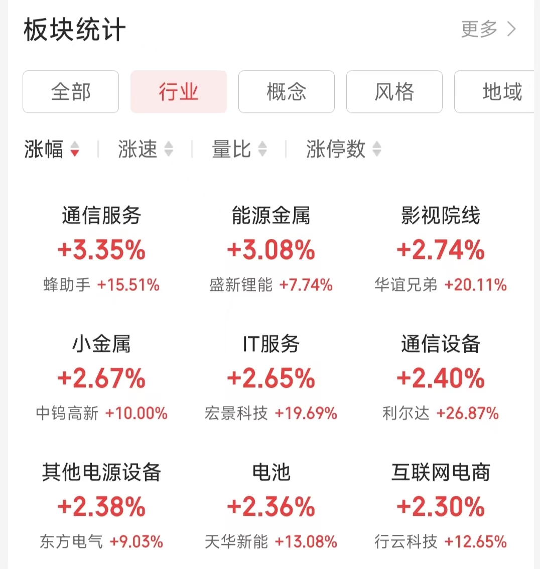 行业热点方面,iFinD数据显示,截至4月16日上午收盘,在同花顺A股二级行业中,通信服务行业涨幅达到3.35%,位居榜首。能源金属(涨幅3.08%)、影视院线(涨幅2.74%)、小金属(涨幅2.67%)等行业紧随其后。此外,IT服务、通信设备、电池等行业也表现活跃,涨幅均超过2%。