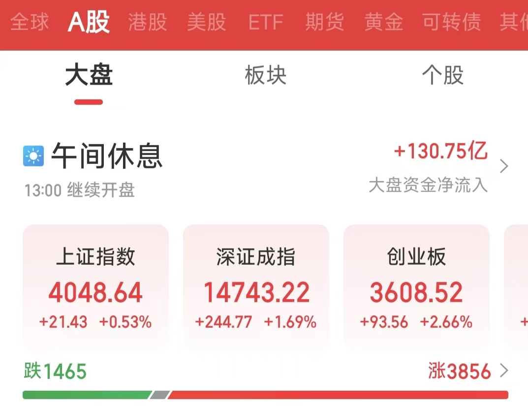 周四(4月16日)早盘,A股三大指数呈现震荡上行态势,市场情绪整体偏积极。截至上午收盘,上证指数上涨0.53%,报4048.64点;深证成指上涨1.69%,报14743.22点;创业板指上涨2.66%,报3608.52点。沪深两市合计成交额14618.73亿元,市场交投活跃。总体来看,个股涨多跌少,共有3856只个股实现上涨。