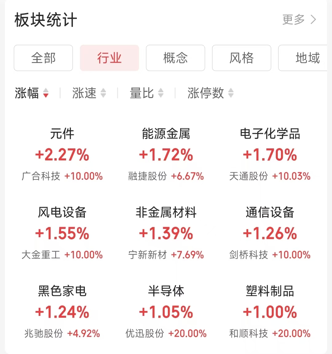 行业热点方面,iFinD数据显示,截至4月17日上午收盘,在同花顺A股二级行业中,元件板块涨幅达到2.27%,位居榜首。能源金属(涨幅1.72%)、电子化学品(涨幅1.70%)、风电设备(涨幅1.55%)等行业紧随其后。此外,非金属材料、通信设备、黑色家电等板块也表现活跃,涨幅均超过1%。
