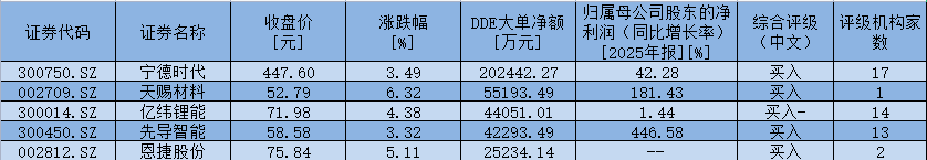 个股方面,龙头效应显著,宁德时代的DDE大单净额位居榜首,达到20.24亿元,位列全部A股市场第二;此外,板块中的天赐材料紧随其后,DDE大单净额为5.52亿元。同时,亿纬锂能、先导智能与恩捷股份等个股同样获得了大单资金的显著净流入,DDE大单净额分别为4.41亿元、4.23亿元和2.52亿元。