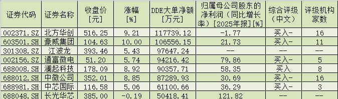 在多重利好共振下,资金的流向验证了市场对半导体板块的抢筹意愿。4月27日,半导体板块DDE大单资金整体呈现显著净流入态势,净流入额达101.03亿元。同花顺数据显示,部分半导体板块个股获得大单资金抢筹。其中,北方华创的DDE大单净额最高,达到11.77亿元;赛微电子紧随其后,DDE大单净额为10.66亿元。此外,江波龙与通富微电等个股同样获得了大单资金的显著净流入,DDE大单净额分别为9.76亿元和9.42亿元。