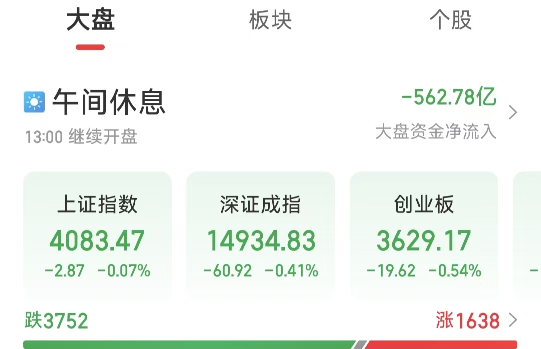 周二(4月28日)早盘,A股市场维持窄幅震荡走势。截至上午收盘,上证指数下跌0.07%,报4083.47点;深证成指下跌0.41%,报14934.83点;创业板指下跌0.54%,报3629.17点。沪深两市合计成交额1.66万亿元,较上一交易日同期略有缩量。总体来看,个股跌多涨少,共有1638只个股实现上涨。