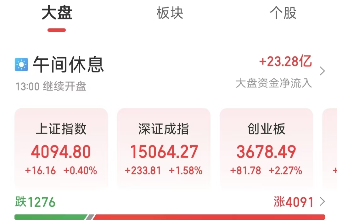 周三(4月29日)早盘,A股市场呈现震荡反弹态势,深市表现显著强于沪市。截至上午收盘,上证指数上涨0.4%,报4094.80点;深证成指上涨1.58%,报15064.27点;创业板指上涨2.27%,报3678.49点。
